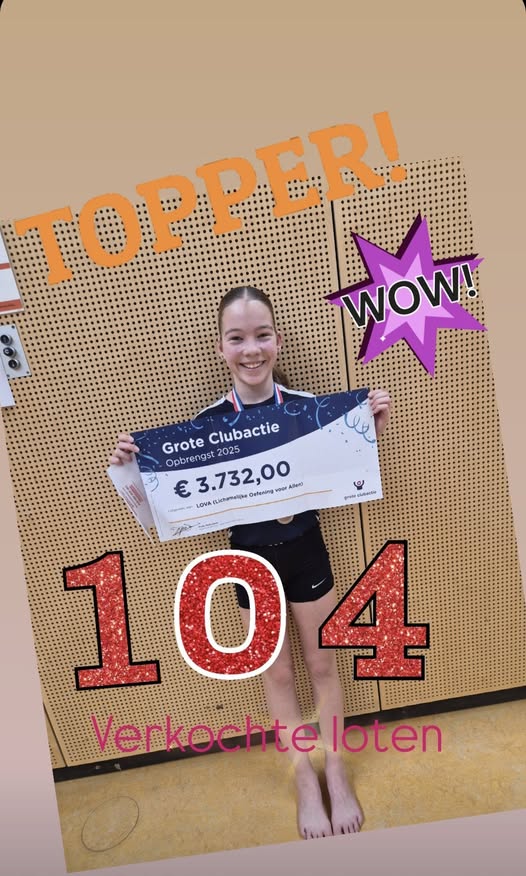 Onze top verkoopster Indy Warner heeft maar liefst 104 loten verkocht. Mede door haar fanatieke inzet hebben onze leden een super mooi bedrag binnen gehaald voor de onderhoud en aanschaf van nieuwe turn/spring toestellen. Wat zijn wij trots op al onze verkopers ✨️👏